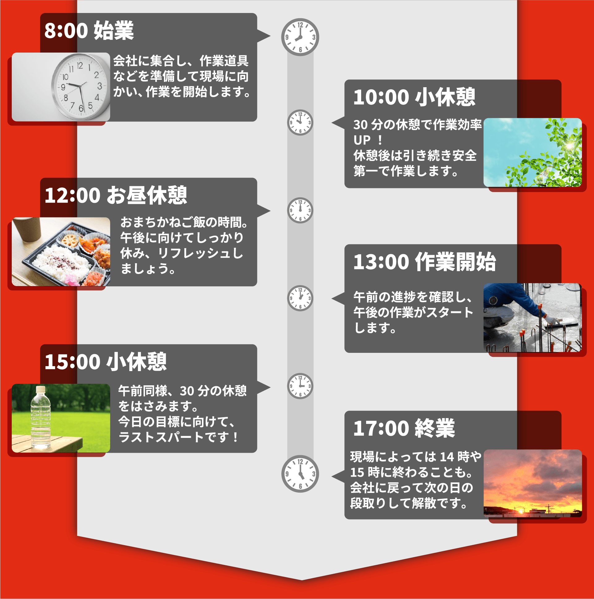| 勤務時間 | 8:00~17:00(休憩2時間)※現場によって異なる |