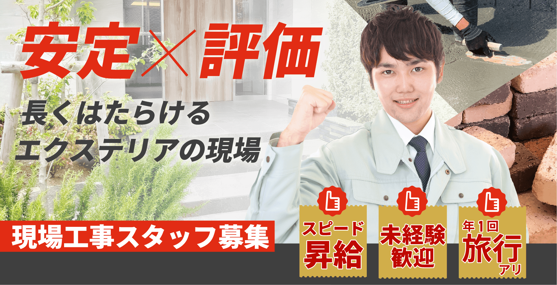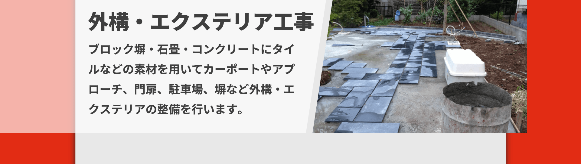 | 業務内容 | タイル・ブロック・れんが工事、外構・エクステリア工事・水回りリフォーム ◎一般住宅やアパートを中心とした作業全般の施工をしていただきます。 例)床や壁に仕上げのタイル貼り、ブロック積み、カーポート取り付け工事、洗面台のリフォームなど |